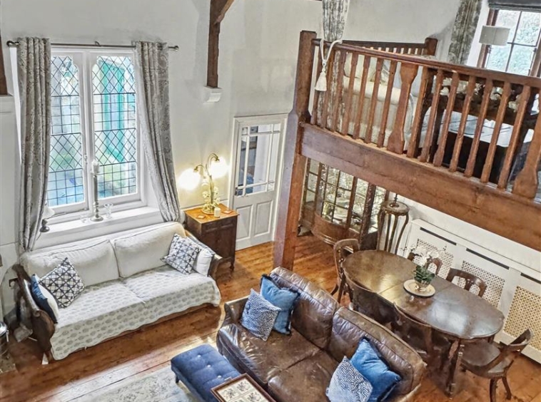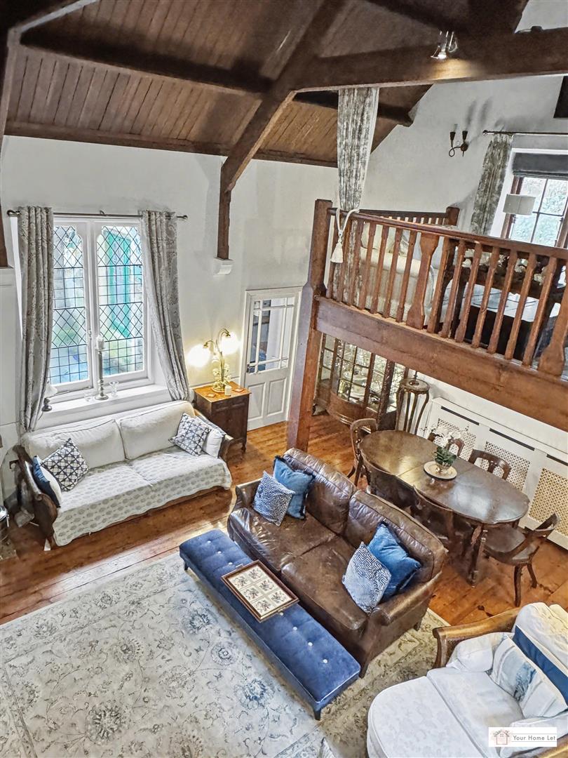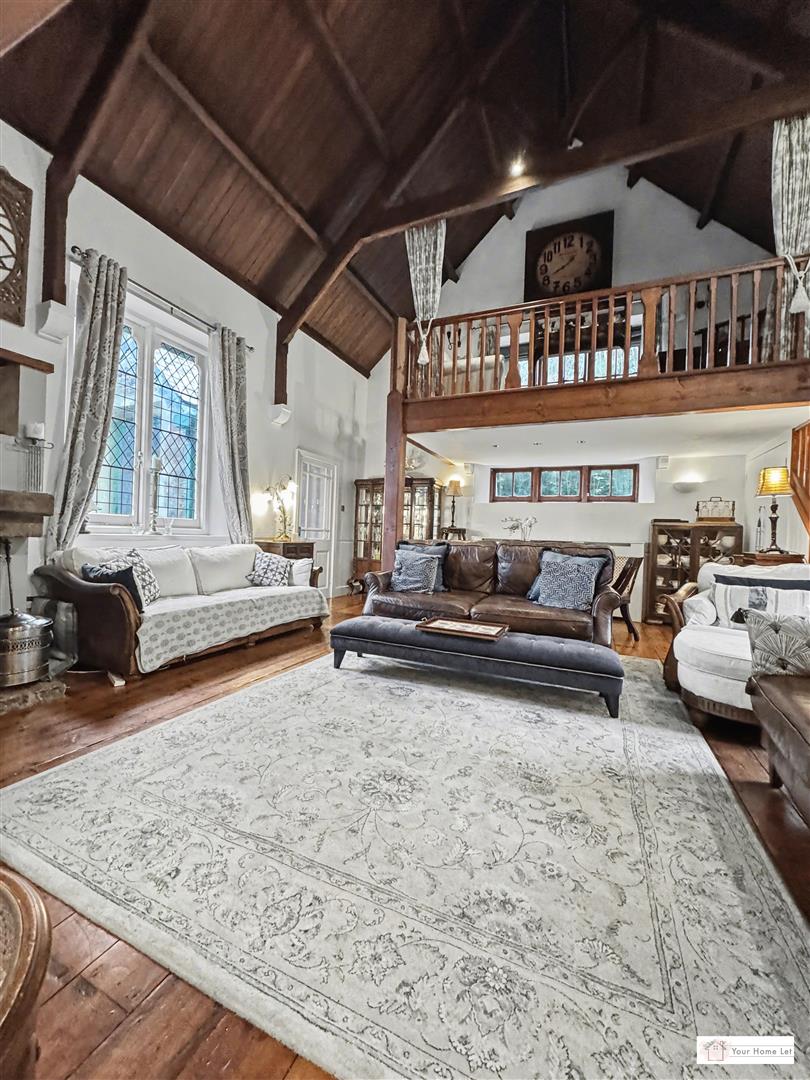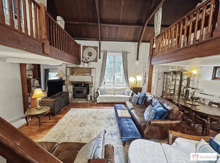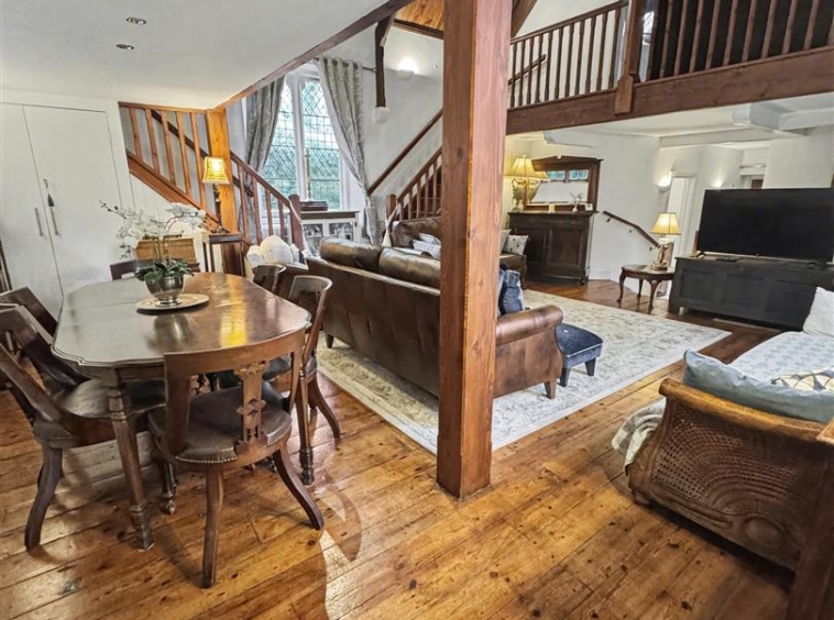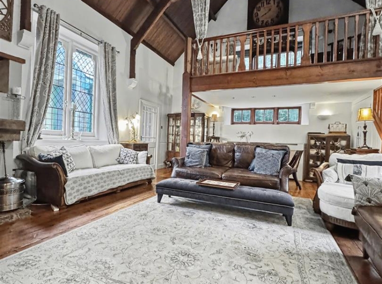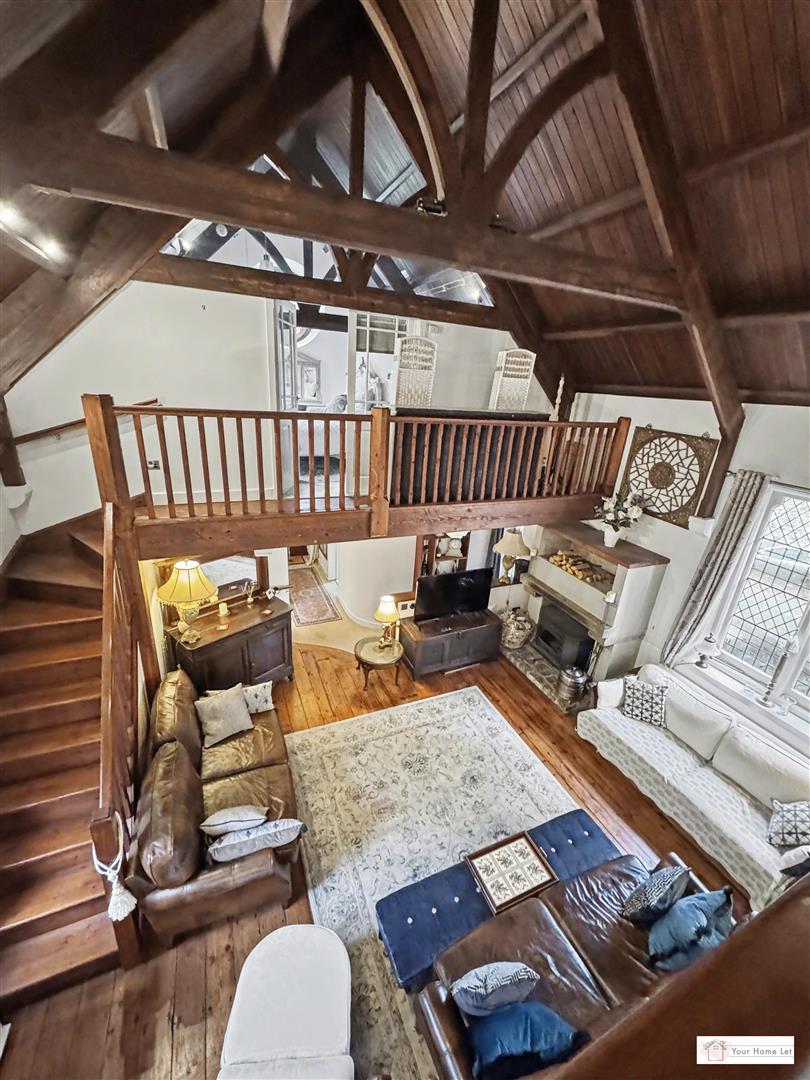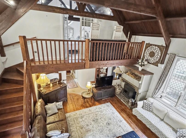 Living Room: 21′ 1″ x 19′ 10″ (6.43m x 6.05m) A stunning room with vaulted ceiling and overlooked by a galleried landing with exposed timber work heated by a substantial wrought iron multi fuel burner, exposed pine flooring, twin staircases rising to the upper floor, up-lighting, triple aspect with leaded windows to side and rear.