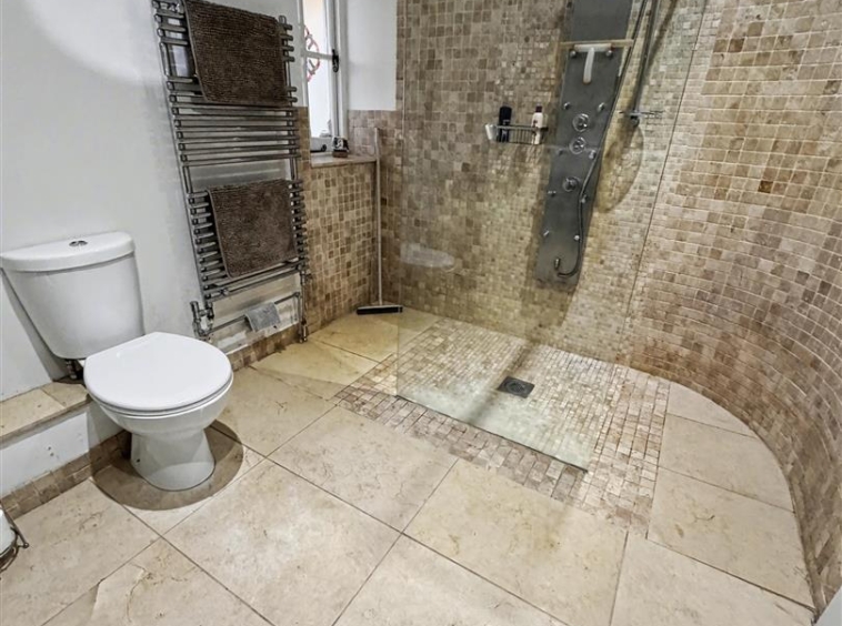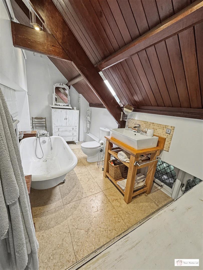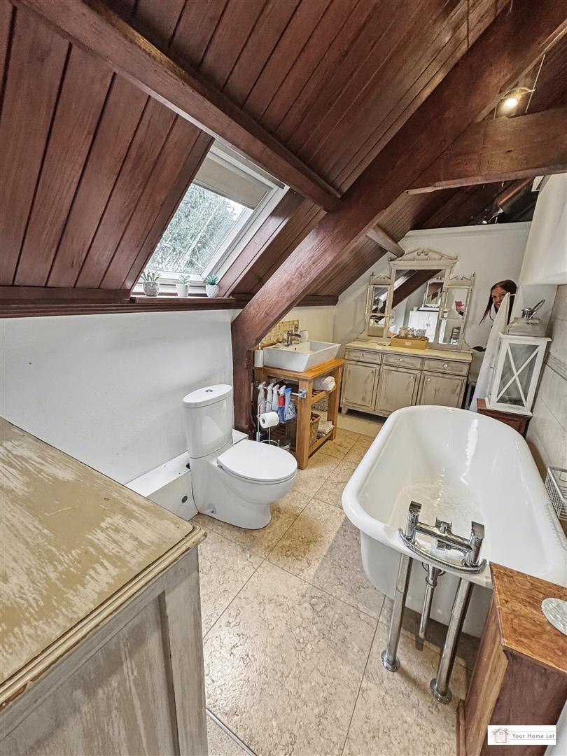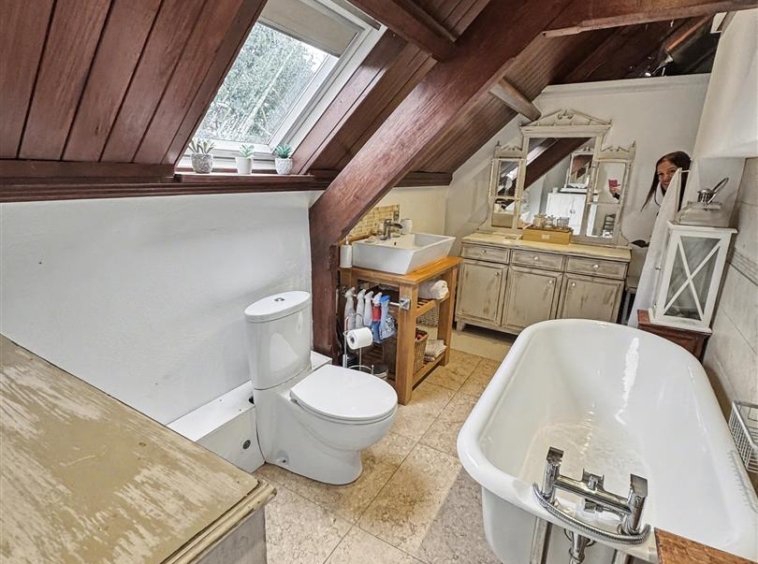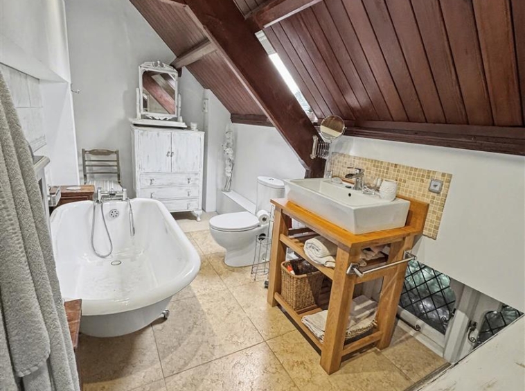 En suite bathroom: 13′ 1″ x 5′ 9″ (4.0m x 1.76m) Open plan to the master bedroom with claw foot bath, low level WC, wash basin, skylight window & window to side, heated towel rail.