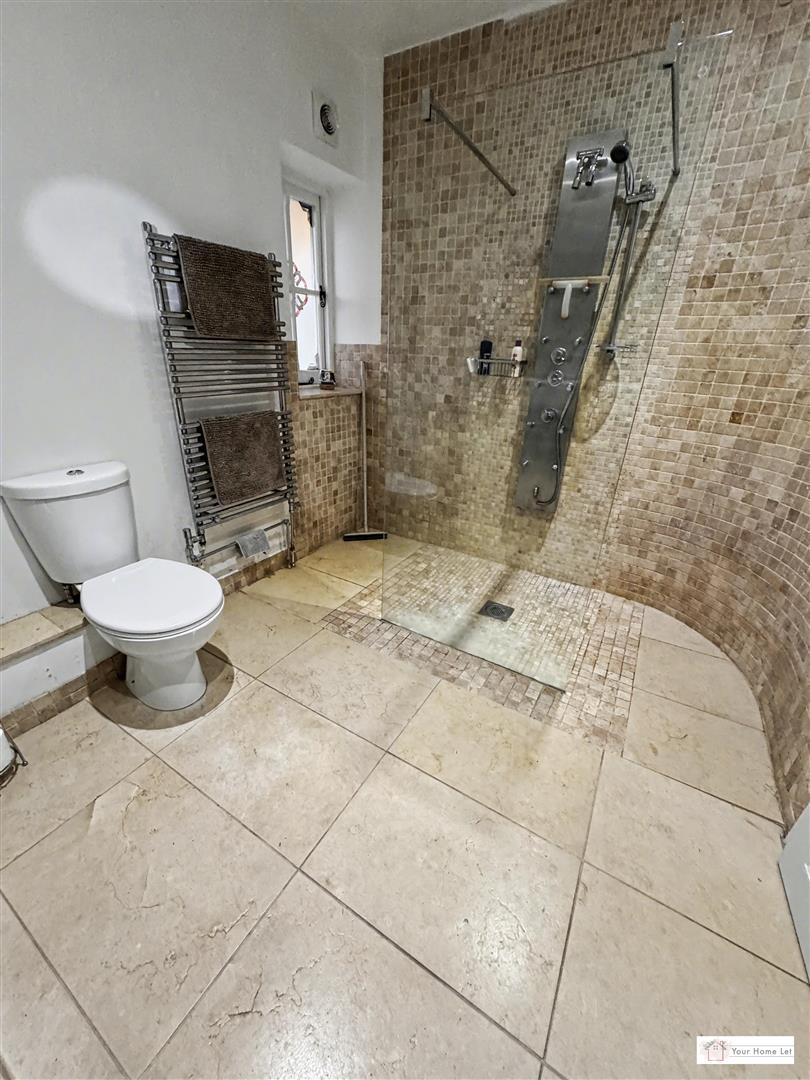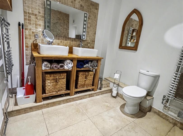 GF Wet Room: 7′ 2″ x 9′ 10″ (2.20m x 3.02m) This spacious wet room boasts a large multi-jet shower with glass surround, ‘his and her’ hand basins with vanity storage underneath and wall mounted LED illuminated mirror, tiled splashbacks and a heated towel rail.