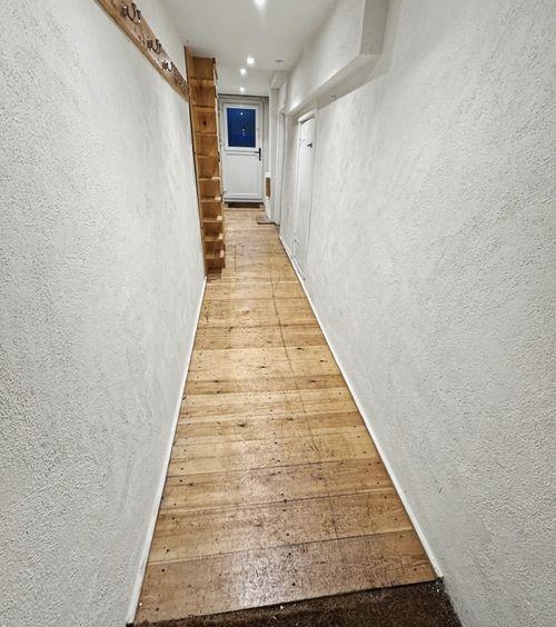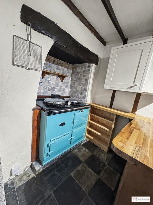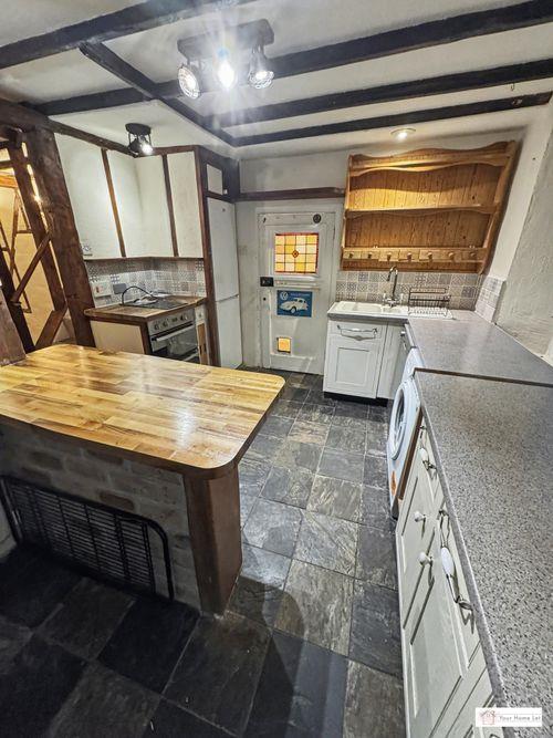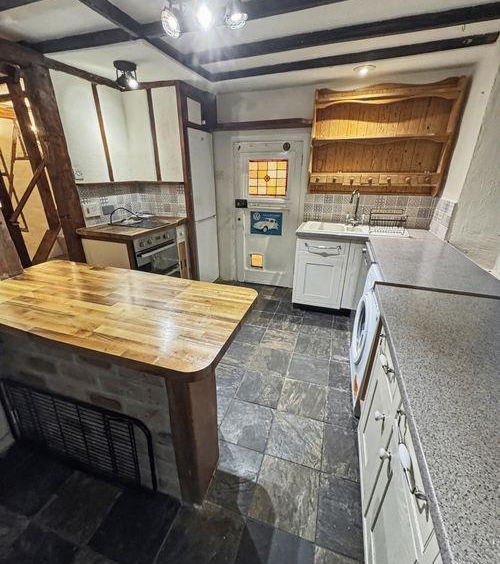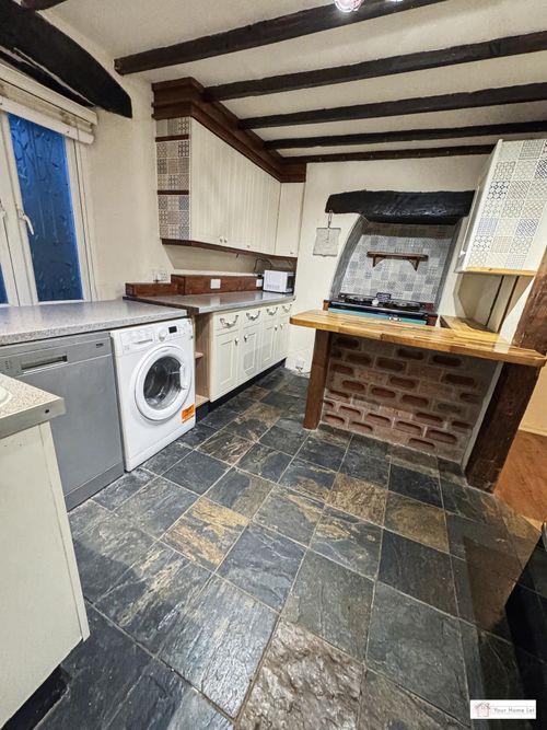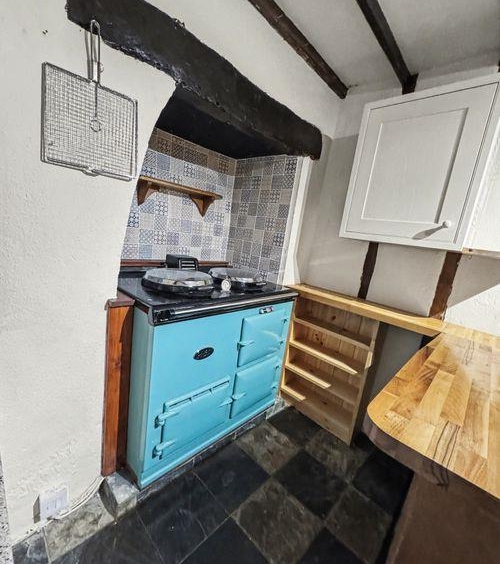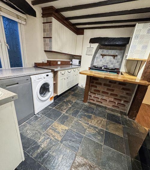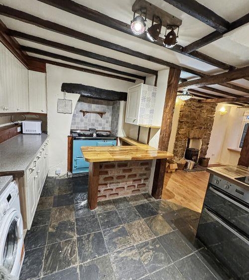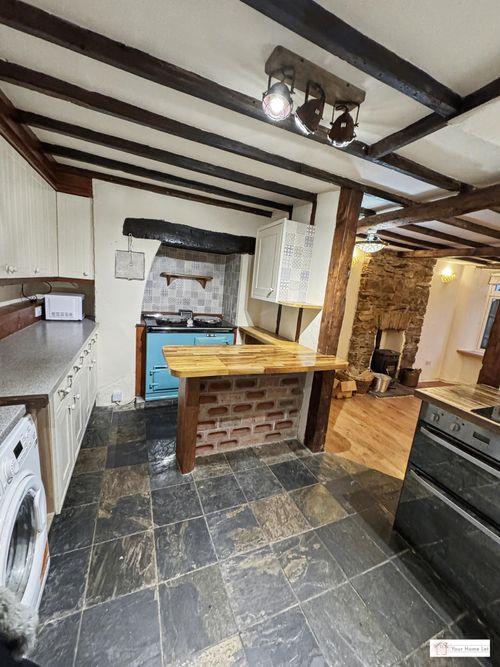 Upon entering the property, you walk into the side passage with storage cupboard under the stairs, built-in wooden cupboard and shoe rack & wooden flooring. A stain-glassed door leads to the fitted kitchen, which has an Inglenook currently housing an aga stove, space for a full size dishwasher & washing machine & an Oak breakfast bar/worktop.
