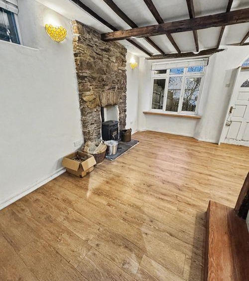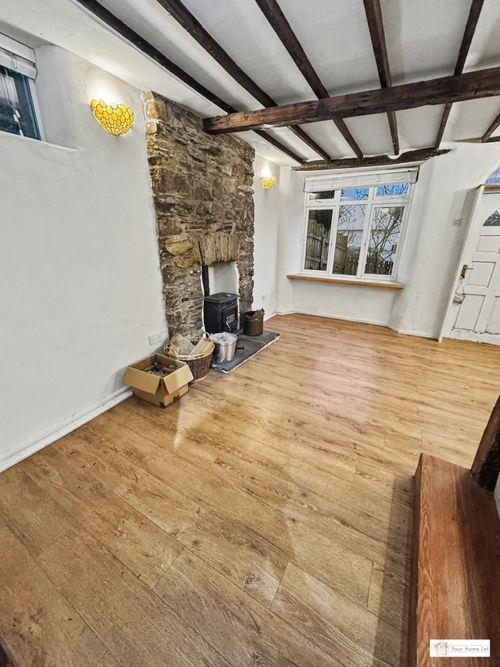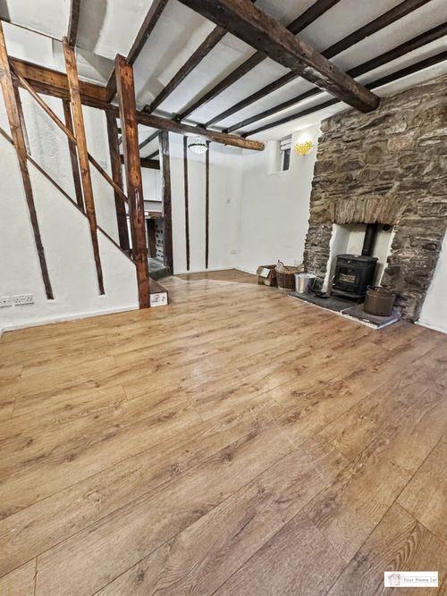 Lounge & dining area, with exposed beams, woodburner, door to garden & stairs to;